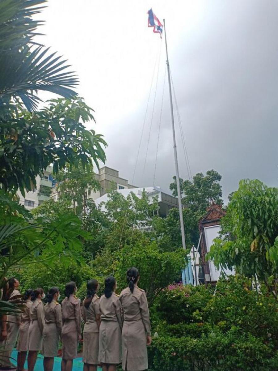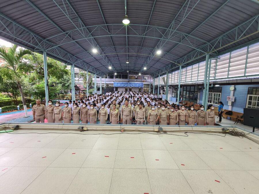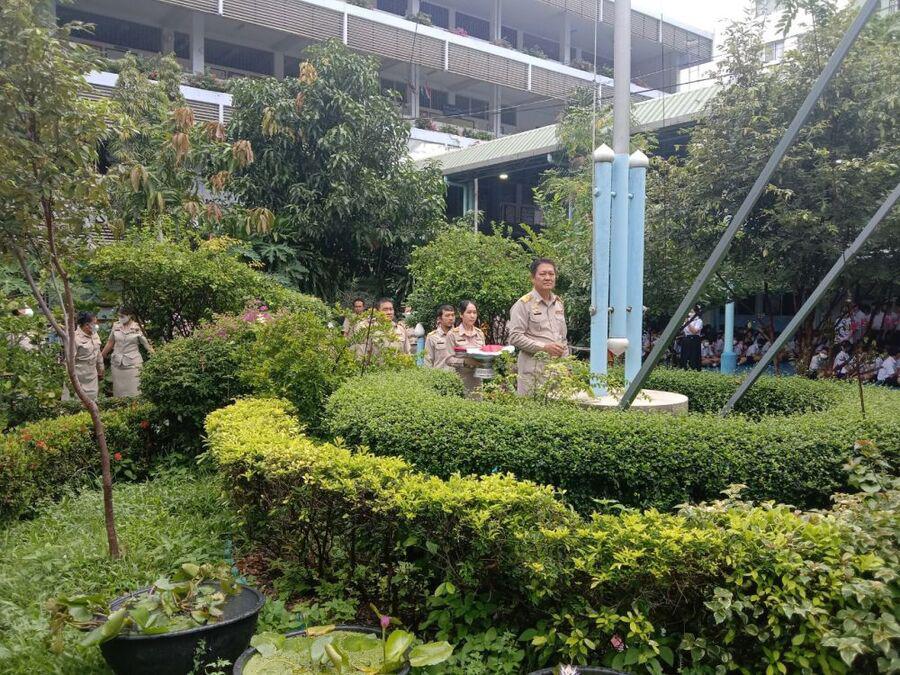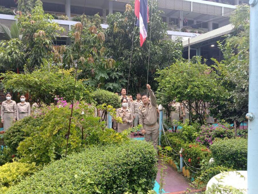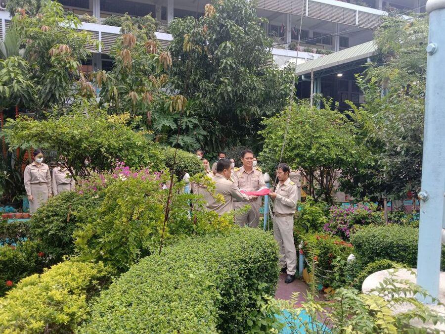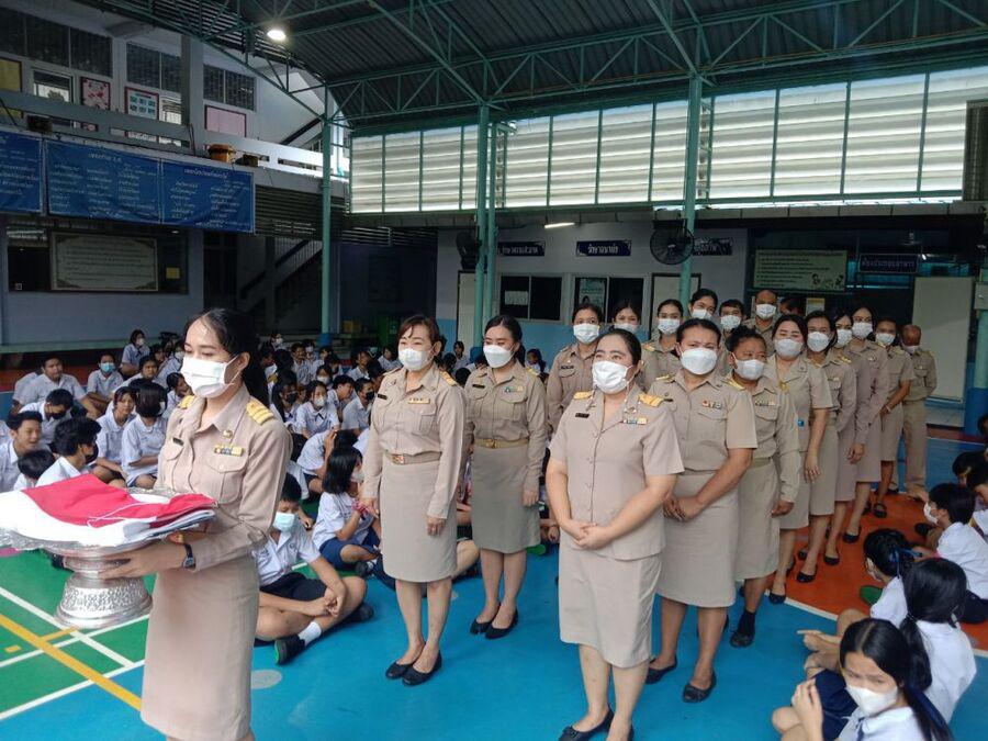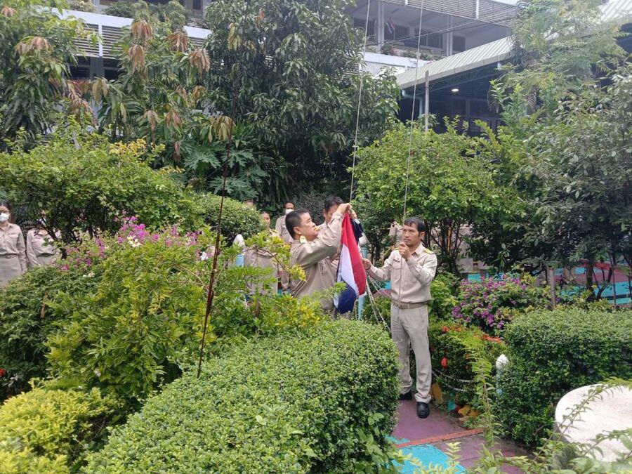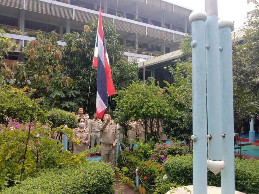 นายสมพงษ์ ธนะสินธุ์ ผู้อำนวยการสถานศึกษา นางสาวญาณิชศา สาตร์พุ่ม รองผู้อำนวยการสถานศึกษา คณะครู บุคลากร และนักเรียน ร่วมกิจกรรมเคารพธง๙าติและร้องเพลงชาติ เนื่องในวันพระราชทานธงชาติไทย S:0