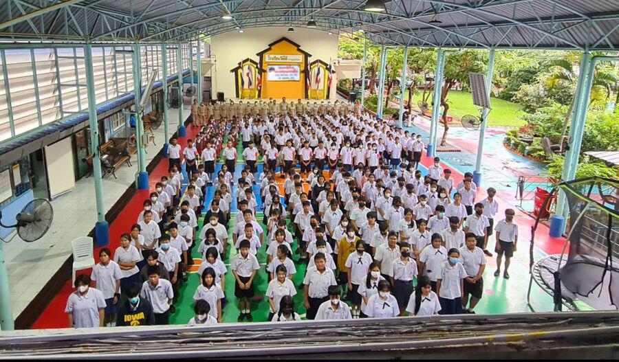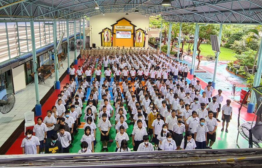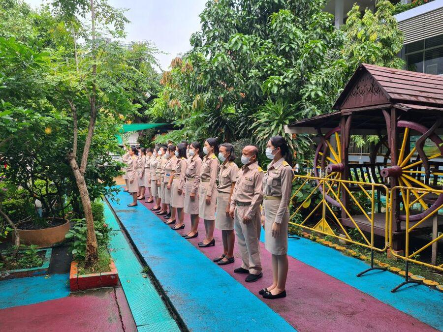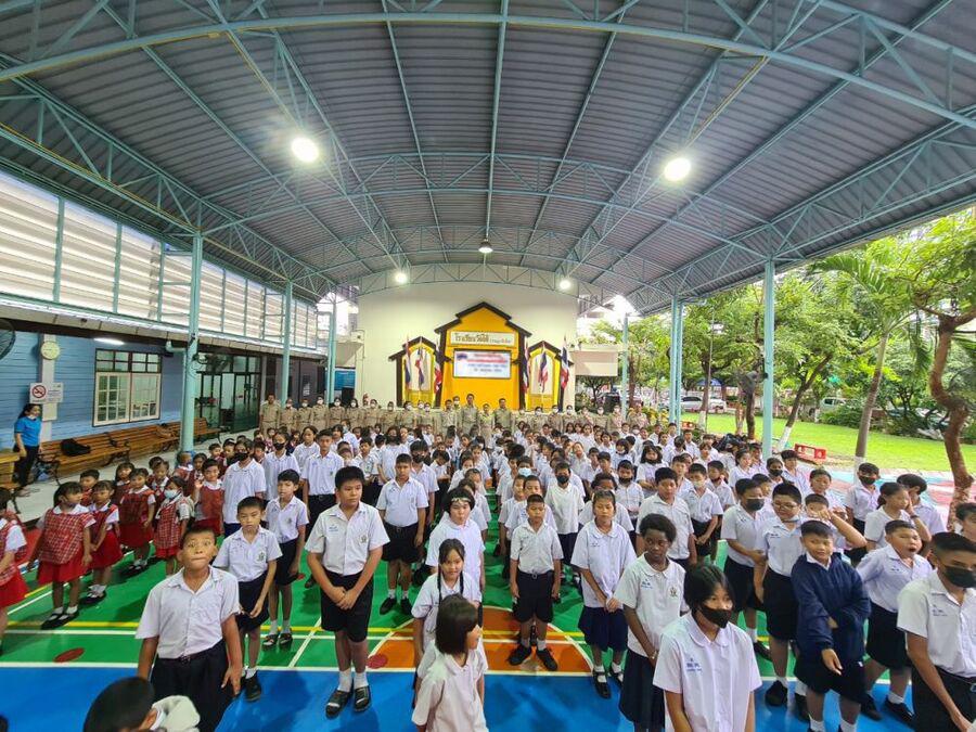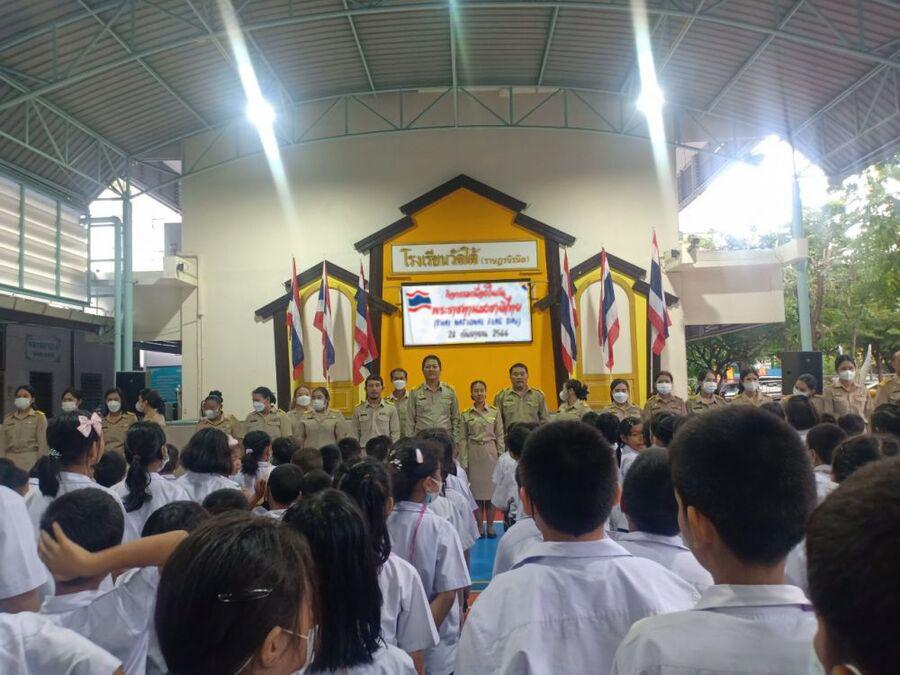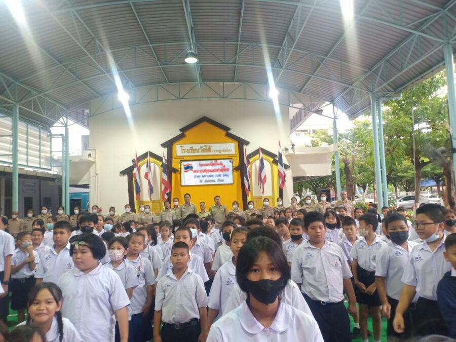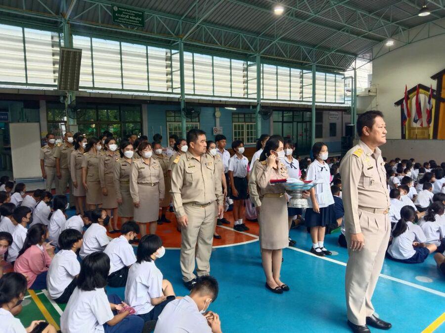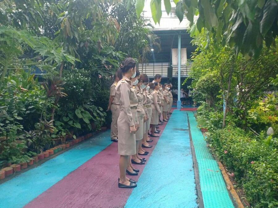 นายสมพงษ์ ธนะสินธุ์ ผู้อำนวยการสถานศึกษา นางสาวญาณิชศา สาตร์พุ่ม รองผู้อำนวยการสถานศึกษา คณะครู บุคลากร และนักเรียน ร่วมกิจกรรมเคารพธง๙าติและร้องเพลงชาติ เนื่องในวันพระราชทานธงชาติไทย S:0
